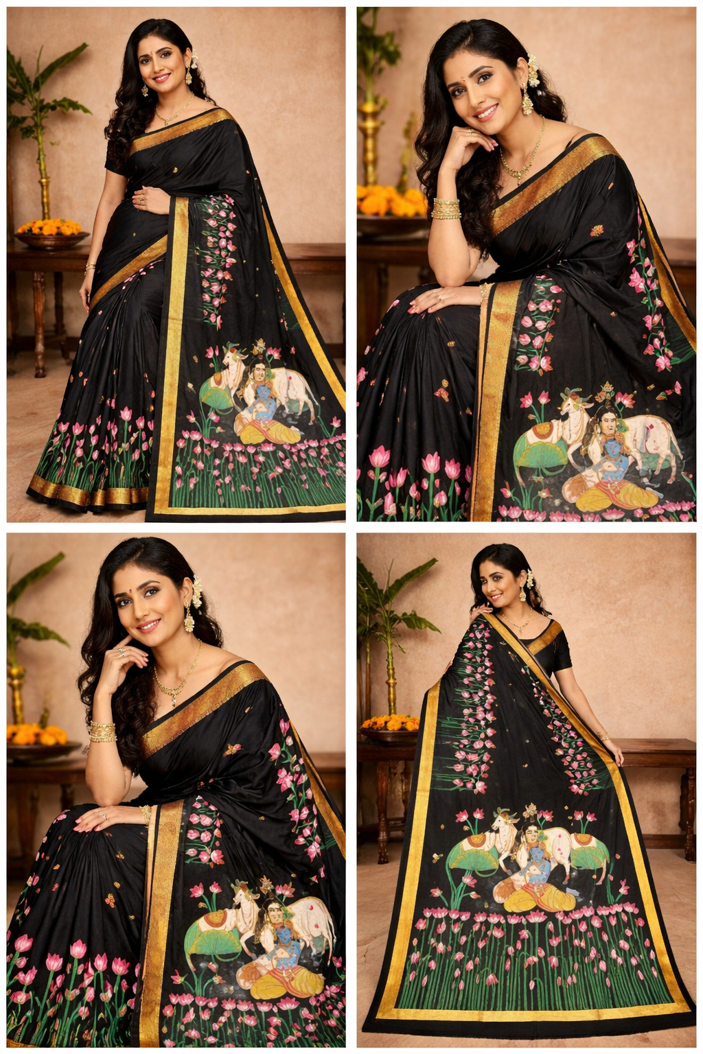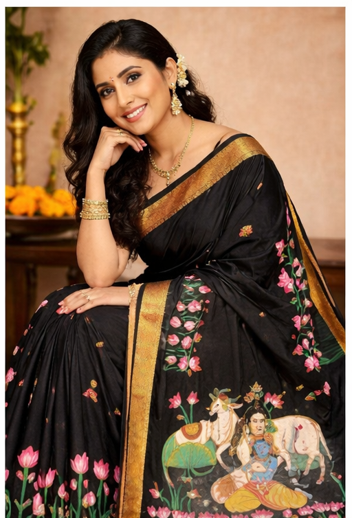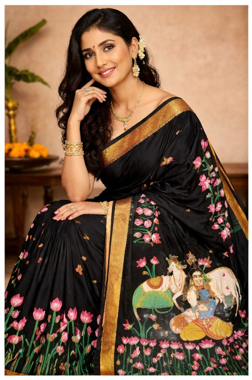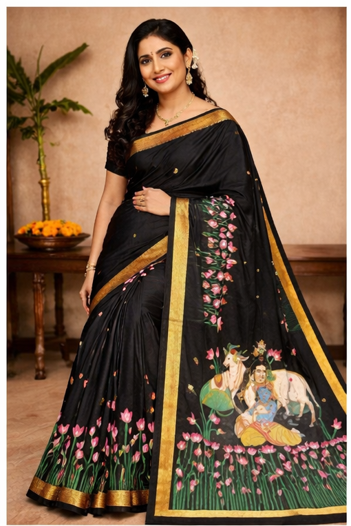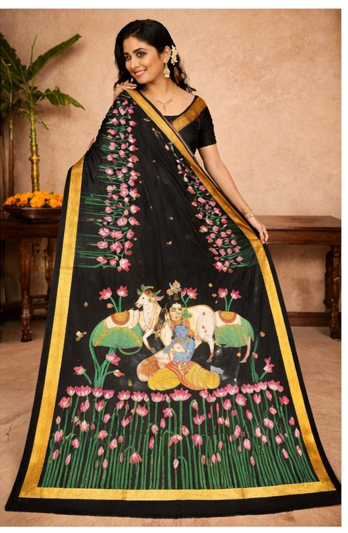 The rich black base enhances the vibrancy of the detailed hand-painted designs, creating a striking contrast that exudes grace, sophistication, and cultural depth. Every motif reflects devotion, heritage, and meticulous craftsmanship, making this saree a true wearable masterpiece.