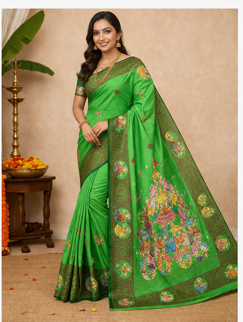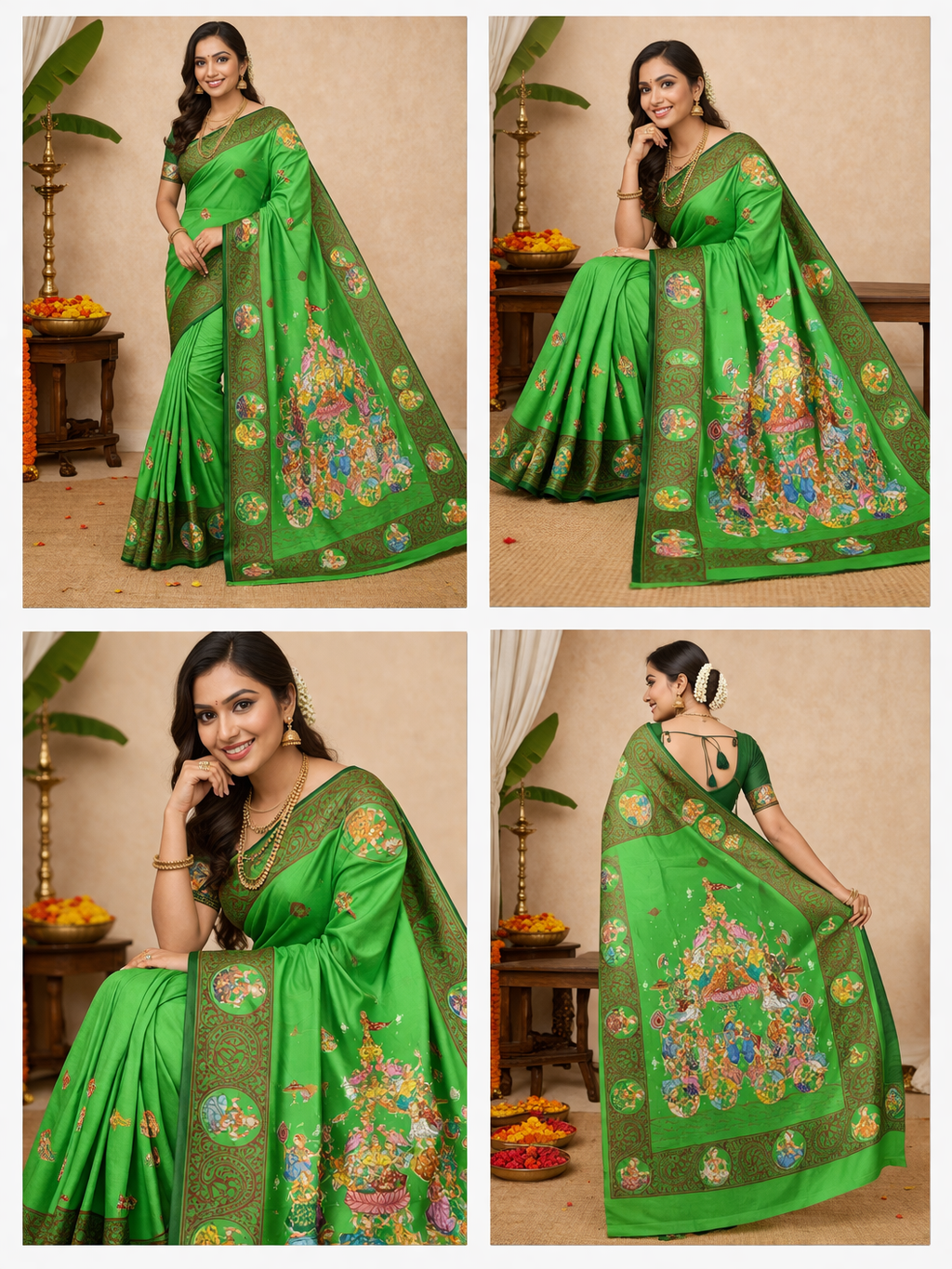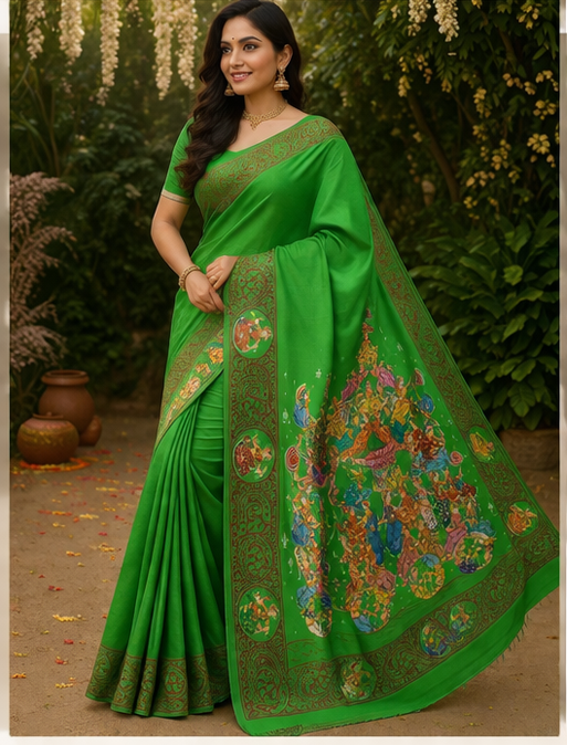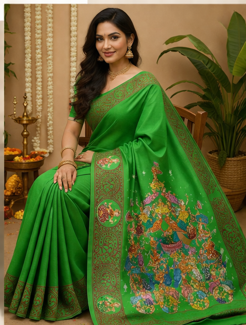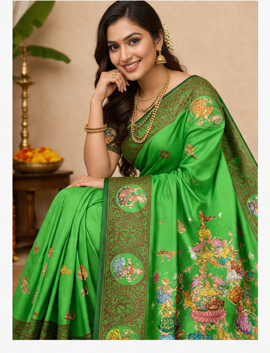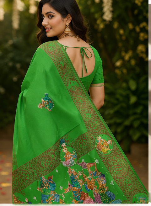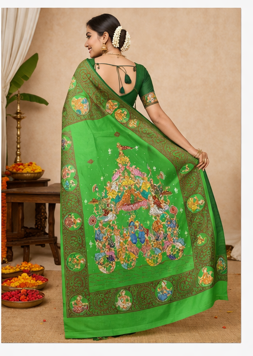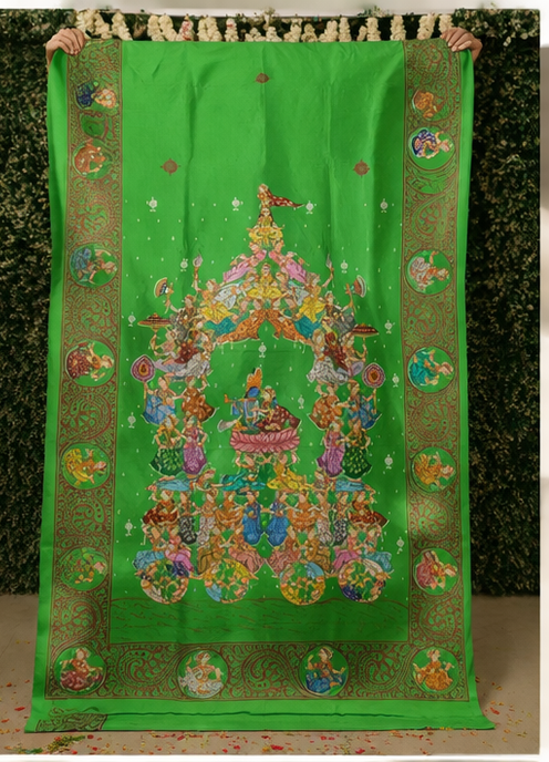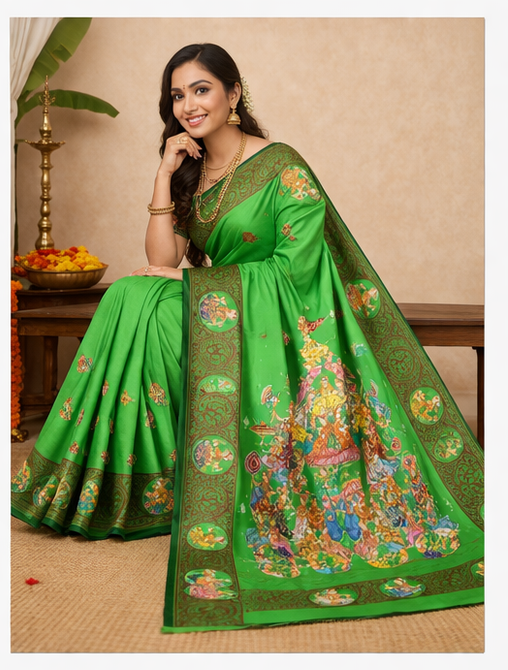 The rich dual-tone green palette adds depth and sophistication, perfectly complementing the detailed mythological motifs and fine brushwork. Every inch of this saree reflects dedication, storytelling, and centuries-old craftsmanship, making it more than just attire—it’s a wearable piece of art.