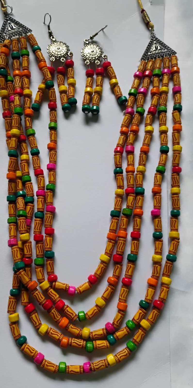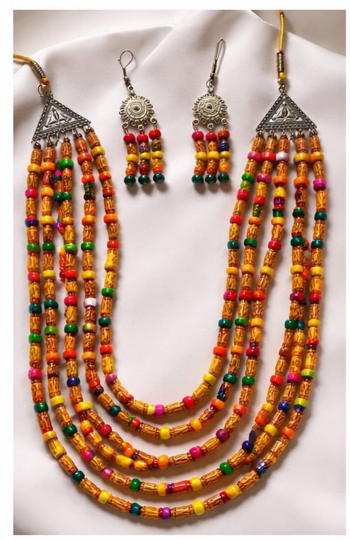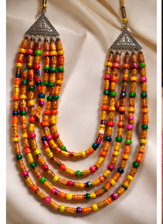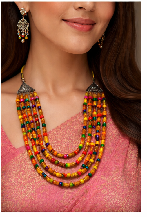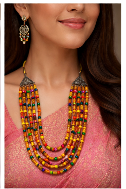 Vibrant Multi-Strand Layout: Featuring a five-tier cascading necklace adorned with colorful “Ranga” accents (hand-painted beads) that add a pop of festive energy.